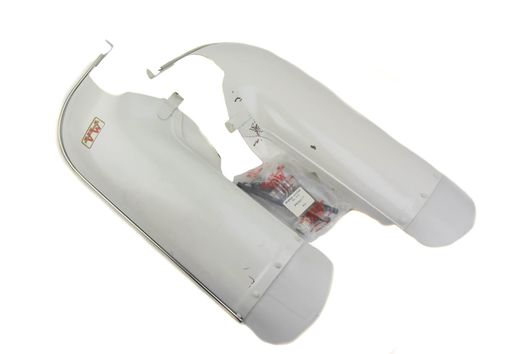 New old stock Peugeot 103 leg shields. Comes with all the nuts and bolts to slap it on your bike.